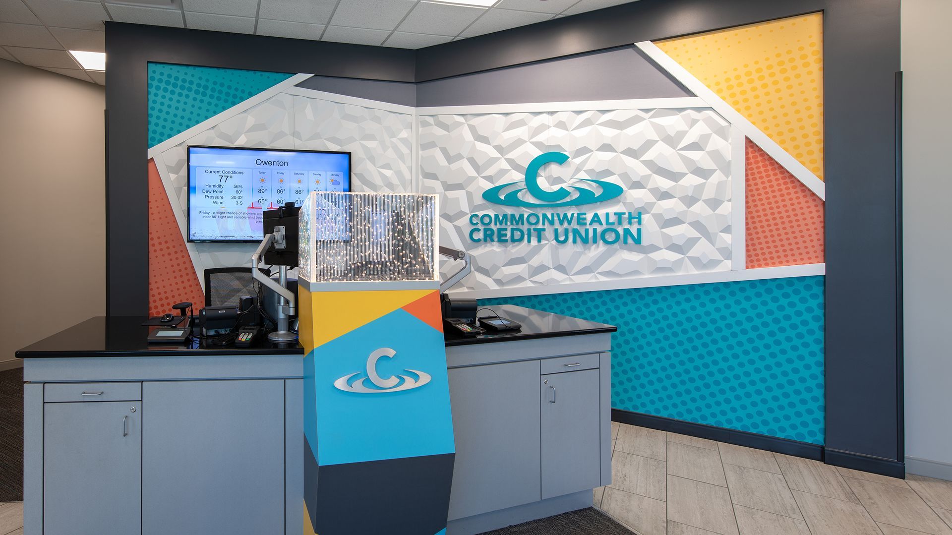 Commonwealth Credit Union collaborated with K4 Architecture + Design to create a new branch in Owenton, KY. The primary goal of this project was to utilize current brand standards while providing a more convenient location for both existing and new members. The intent was to embody the Commonwealth Credit Union established brand identity, ensuring ease of access and functionality for members.