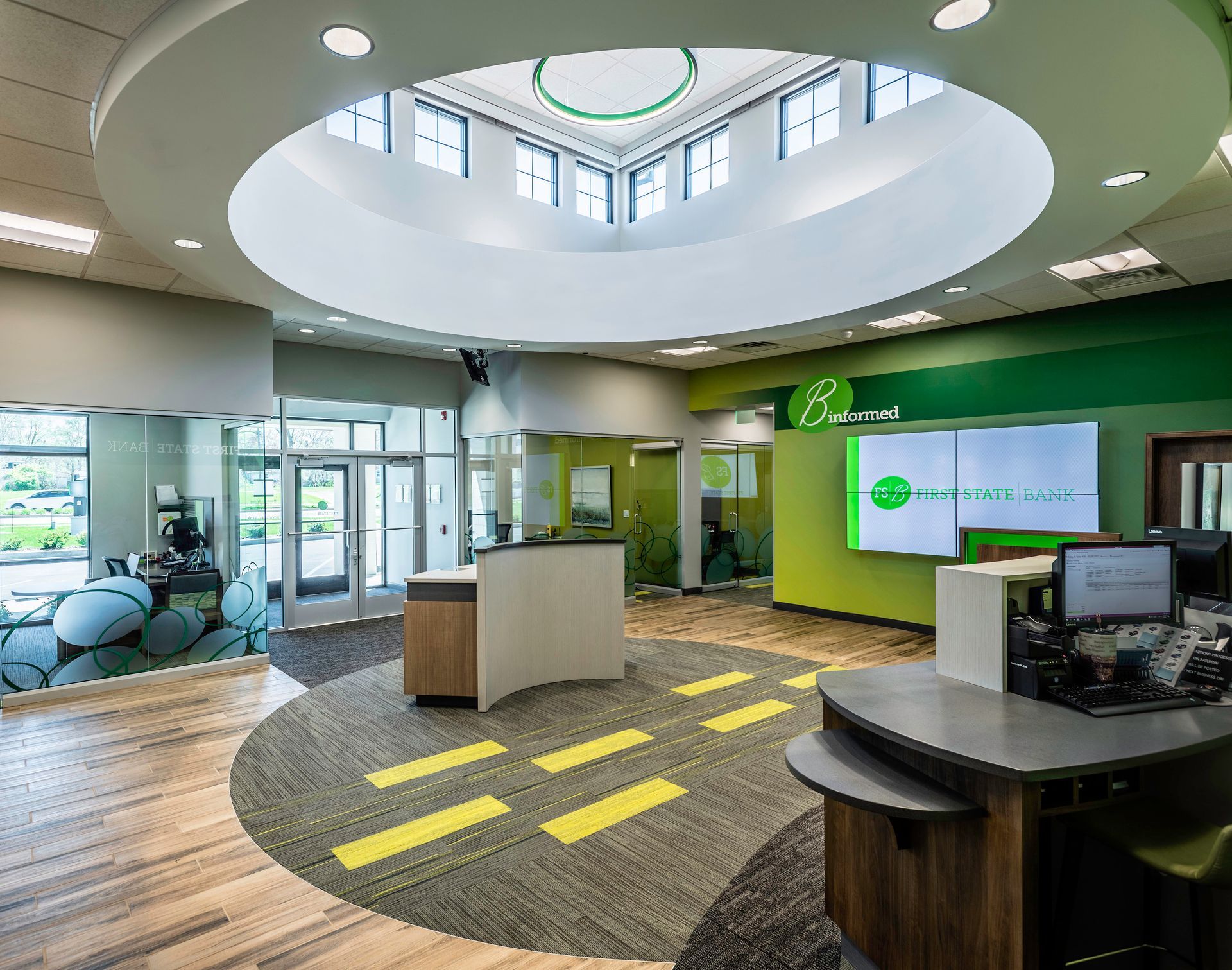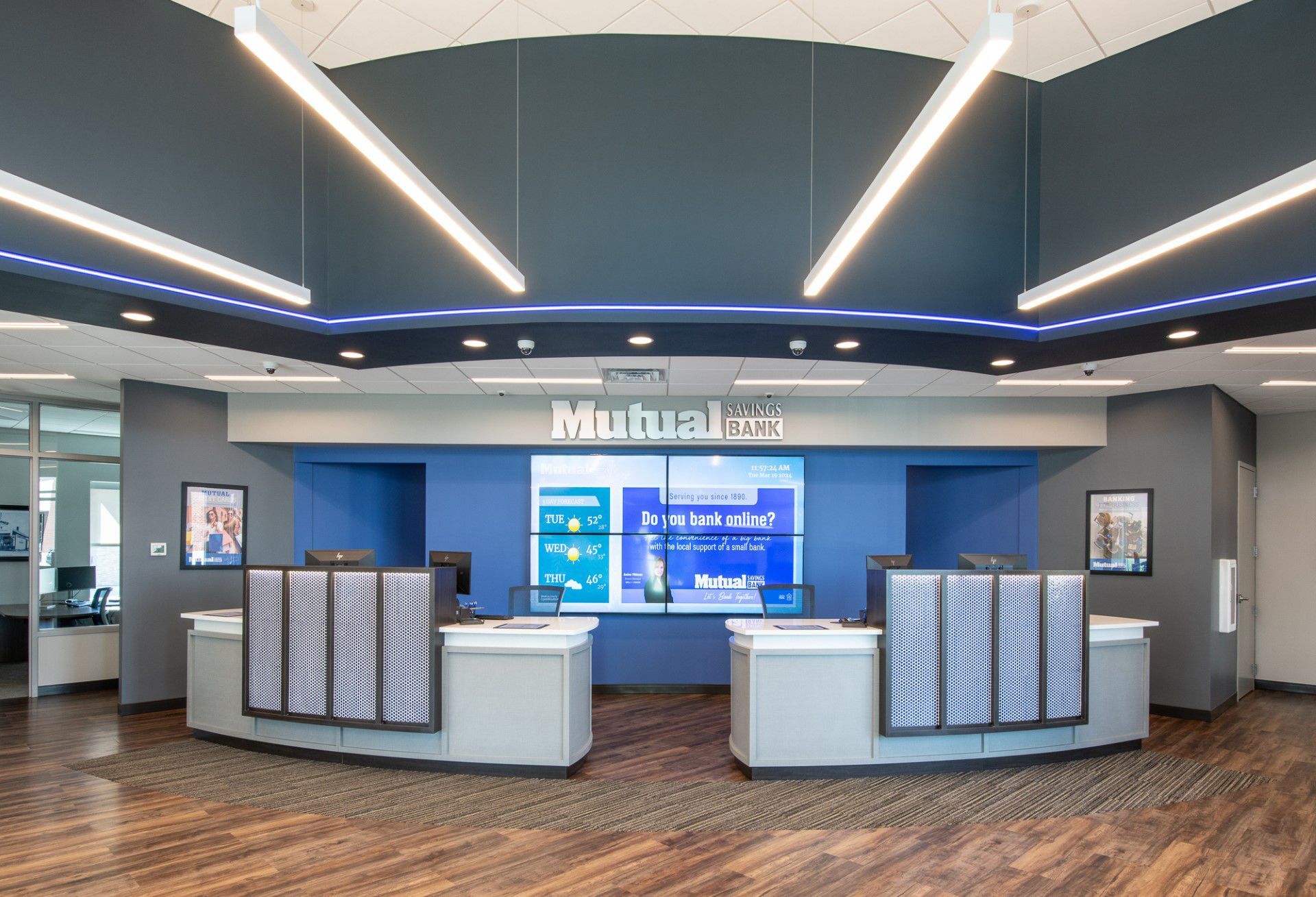 For instance, incorporating private meeting rooms alongside communal areas and co-working spaces ensures that the branch can serve as both a place for personal consultations and a hub for community interaction. Meanwhile, modern aesthetics and engaging technology, such as interactive displays and digital kiosks, can be seamlessly integrated with clear signage and wayfinding tools, and community or history walls, to enhance the overall customer experience.