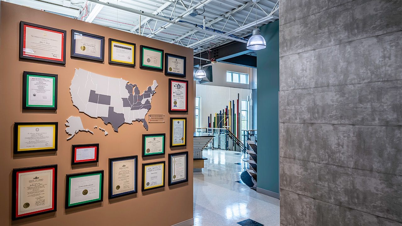 Interior finishes and environmental graphics created by the K4 Team highlight the K4 services & creates a branded look throughout the office space.