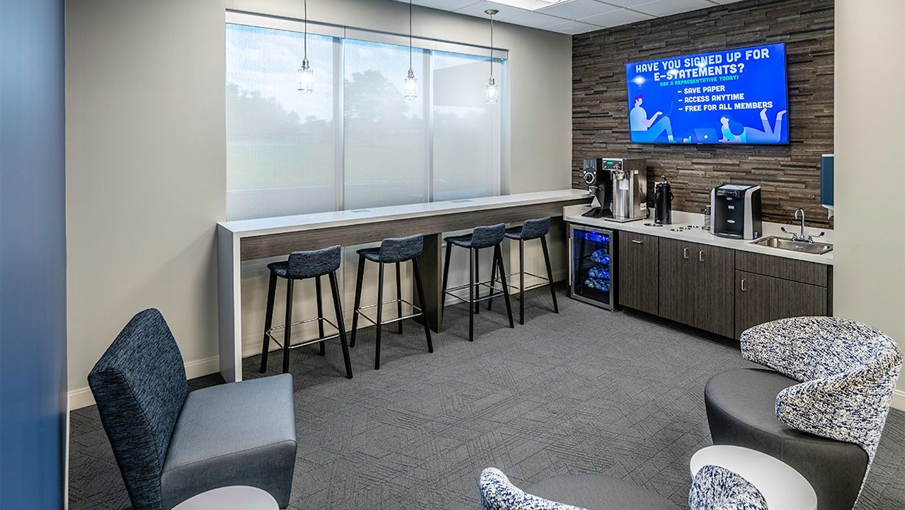 The interior was designed to accommodate both a 4,300 s.f. branch space as well as a 1,700 s.f. Community Room, each with their own separate entrance vestibule and restroom access, so the Community Room could be used after traditional business hours. The interior design of the branch is very similar to the Troy location and features two (2) teller pods, four (4) offices, a conference room, waiting area with refreshments, a teller work room, and an employee break room.