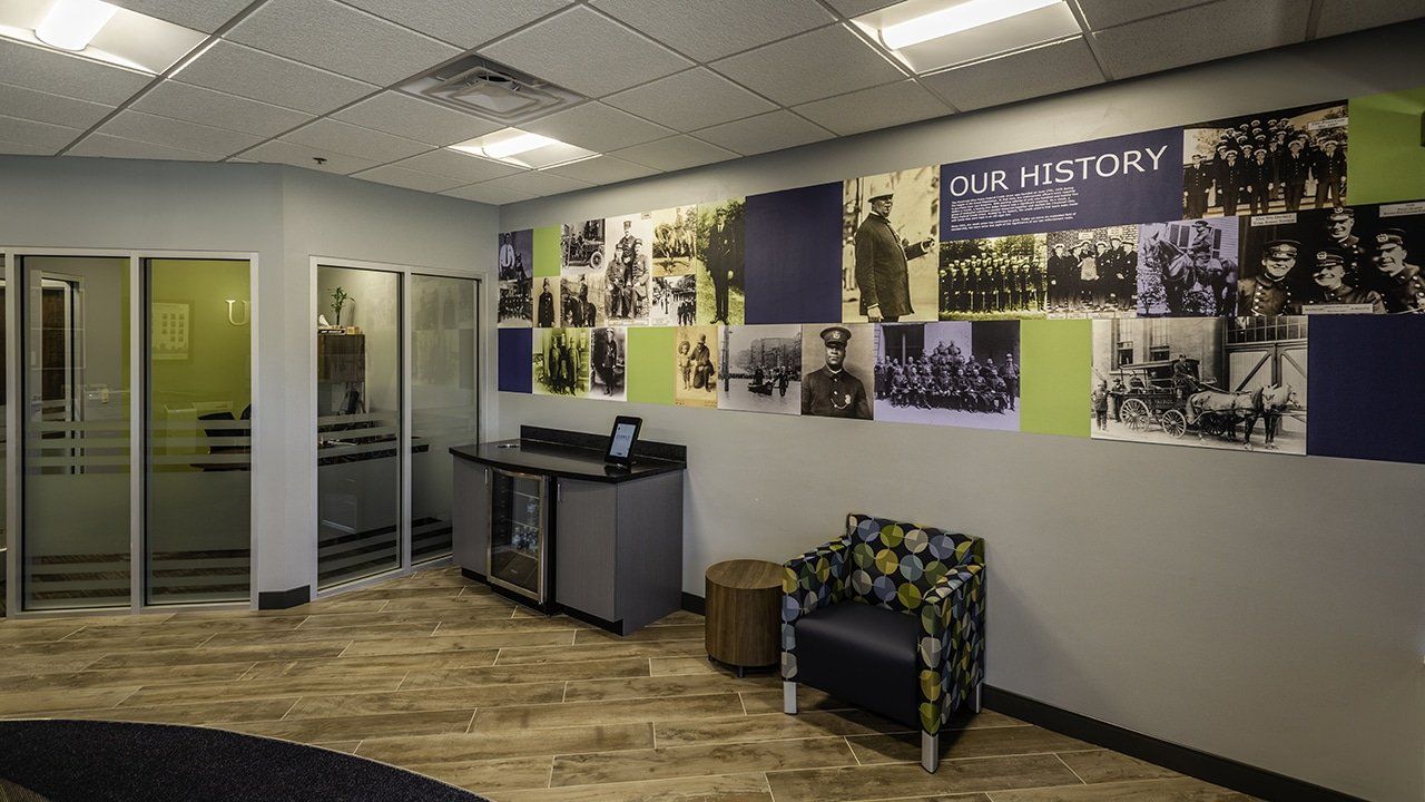The teller line functions as a multiple use area that includes a concierge station, workspace, and concealed chairs for the employees. The environmental graphics in the lobby incorporate many important photographs and information pertaining to the long-respected history of the Cincinnati Police Department that is also consistent with COP’s other branches.