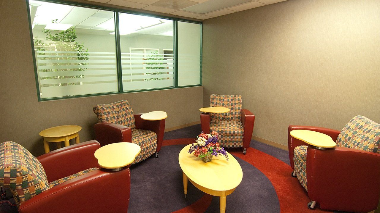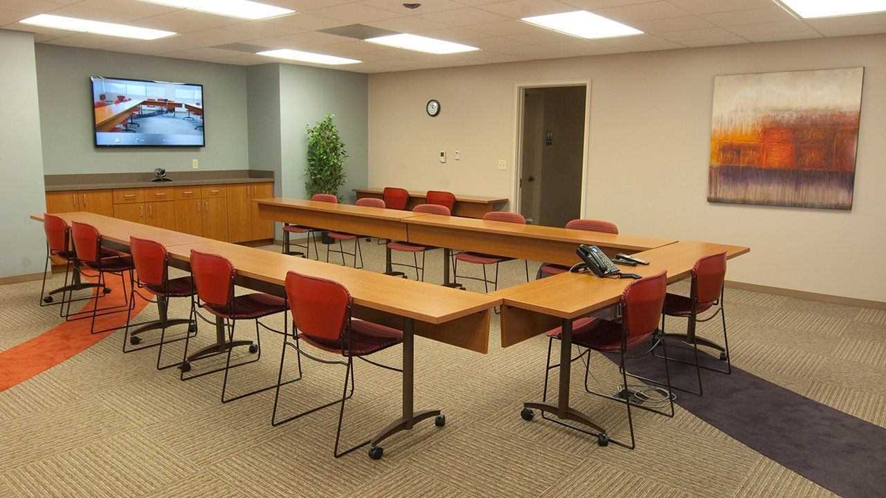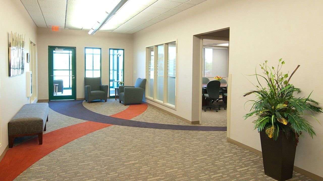 The new addition features a training room, several breakout rooms, conference rooms and a lounge. The new entry ties into an existing green, glowing skylight design element.