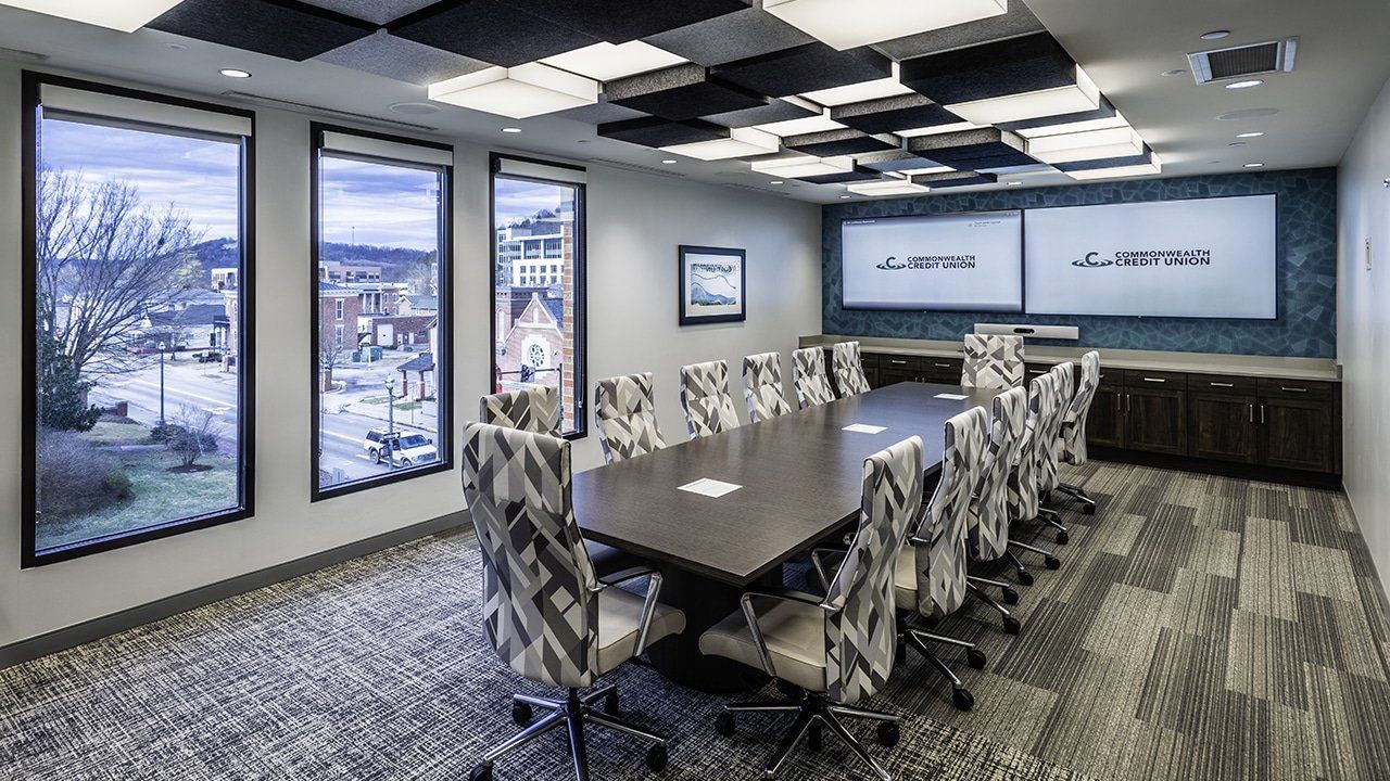 Commonwealth Credit Union was seeking improved efficiency and operations in their Executive Office space remodel. The existing Executive Area lacked consistency with the established Commonwealth brand that K4 had assisted in implementing in various Commonwealth branches. The goals for the remodel included making space for Executives & Upper Management from various locations to be housed in this one central location; offering opportunities for collaboration via multiple meeting spaces and conference/board rooms, dining areas, and filming space for commercial production.