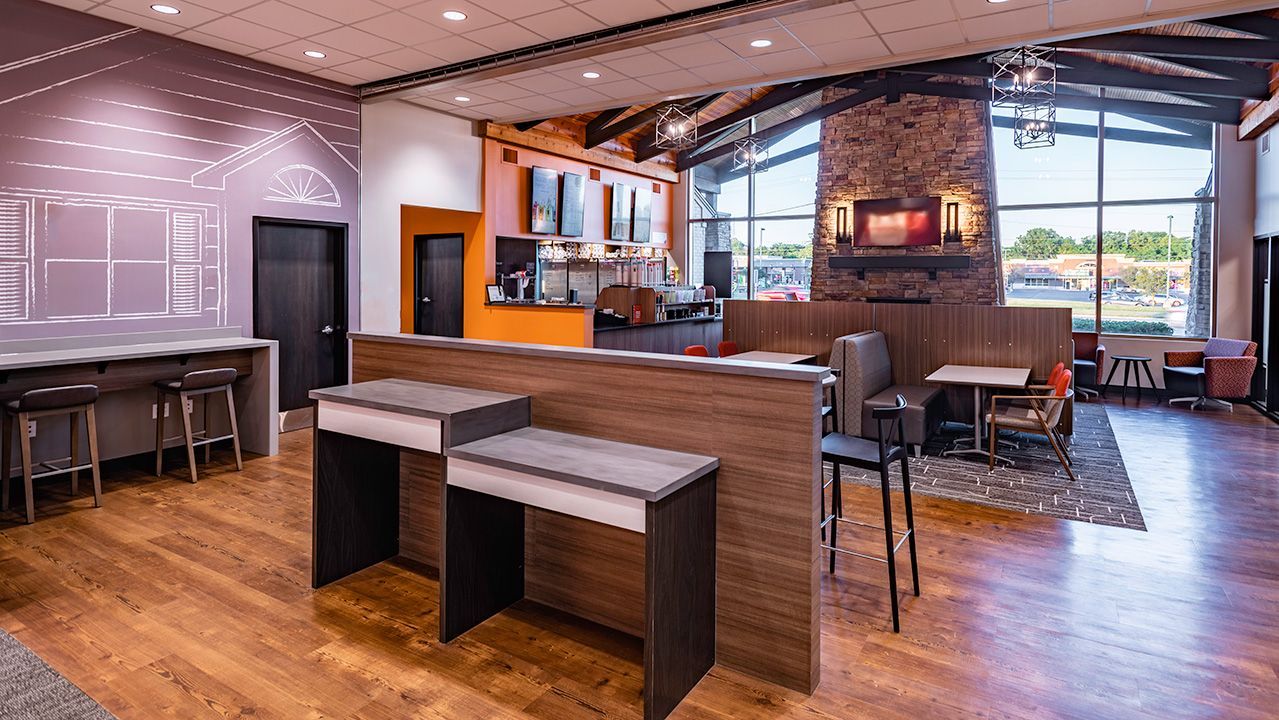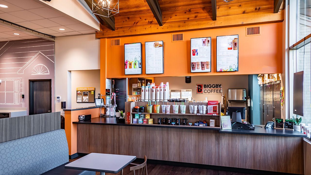 Combining a café with retail bank space poses special design challenges and decisions to be overcome as pertaining to the design and code requirements that would allow for customers and employees to use both co-tenant spaces. In response to this, a second drive through lane for the coffee shop, that would not compete with the bank drive through, was created by adding approximately 120 SF to the front right side of the building for the Biggby Coffee.