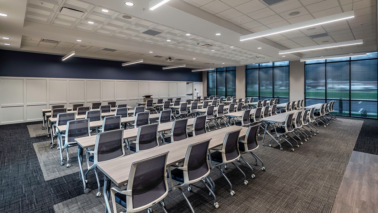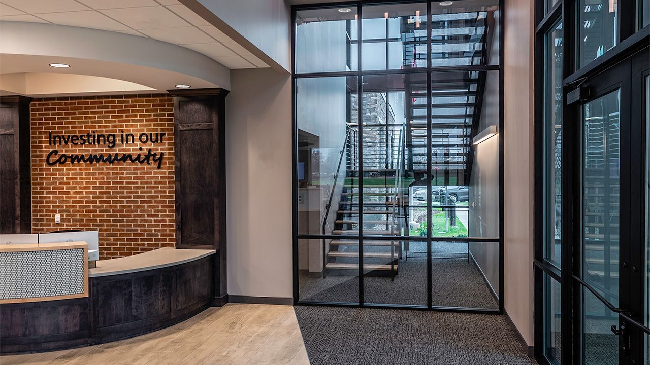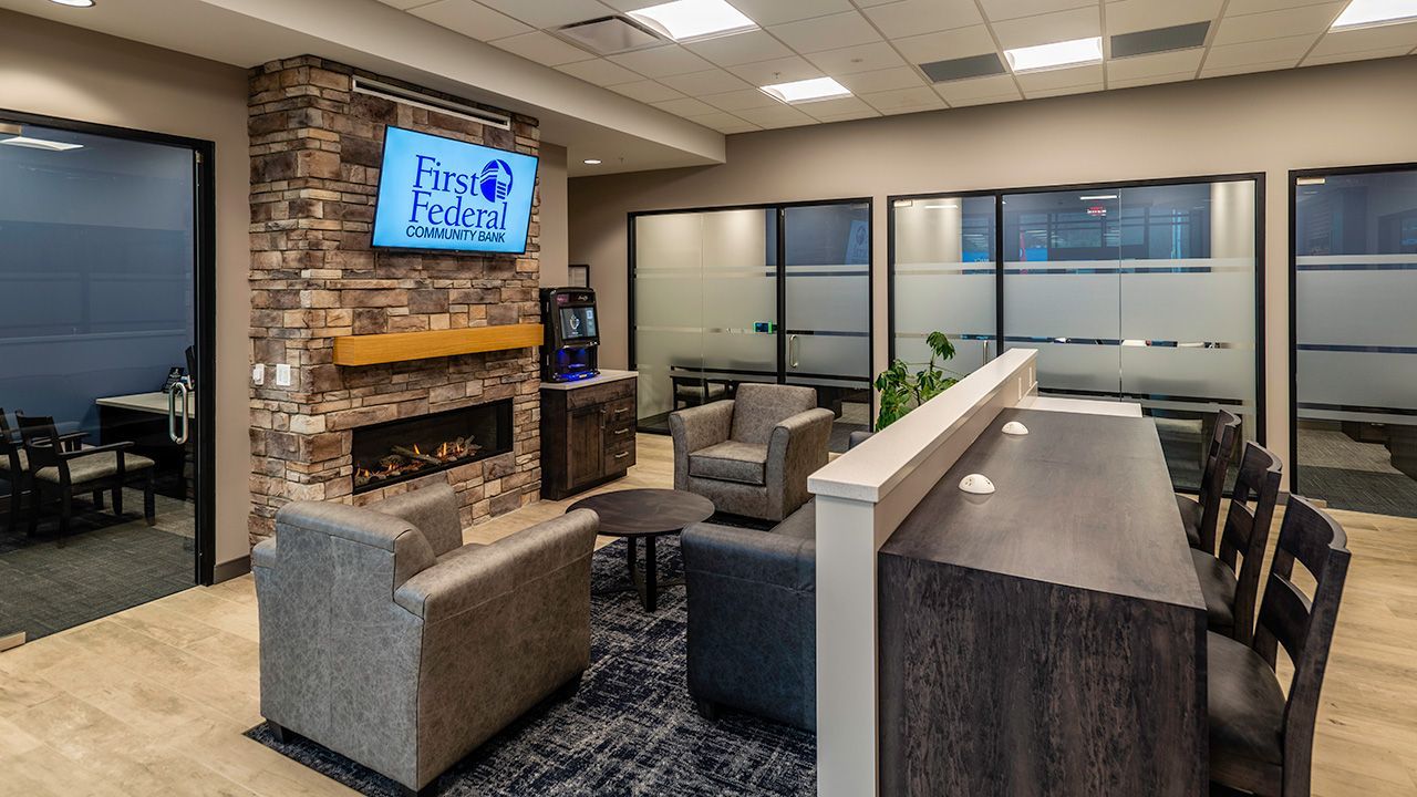 The interior of building was designed to be warm & inviting, starting with a fireplace lit lobby. In addition, First Federal provided their own furniture and heavy wood Amish casework to add to the atmosphere. Their main brand color, blue, was utilized in accents all throughout the space. For employee retention, there are the benefits of a game room and an exercise room with access to a shower.