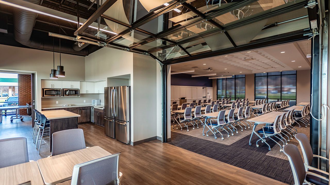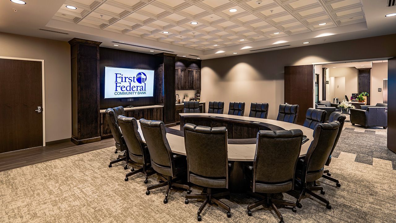 At First Federal Community Bank they say, “investing in our community isn’t just a slogan – it’s the way we do business.” With this philosophy in mind, they wanted to create a community room/event space that could accommodate up to 100 people and be used by both the bank and the public. The new community room is directly adjacent to the break room, separated by a fully functional glass garage door, offering flexibility for two separate or one large space.