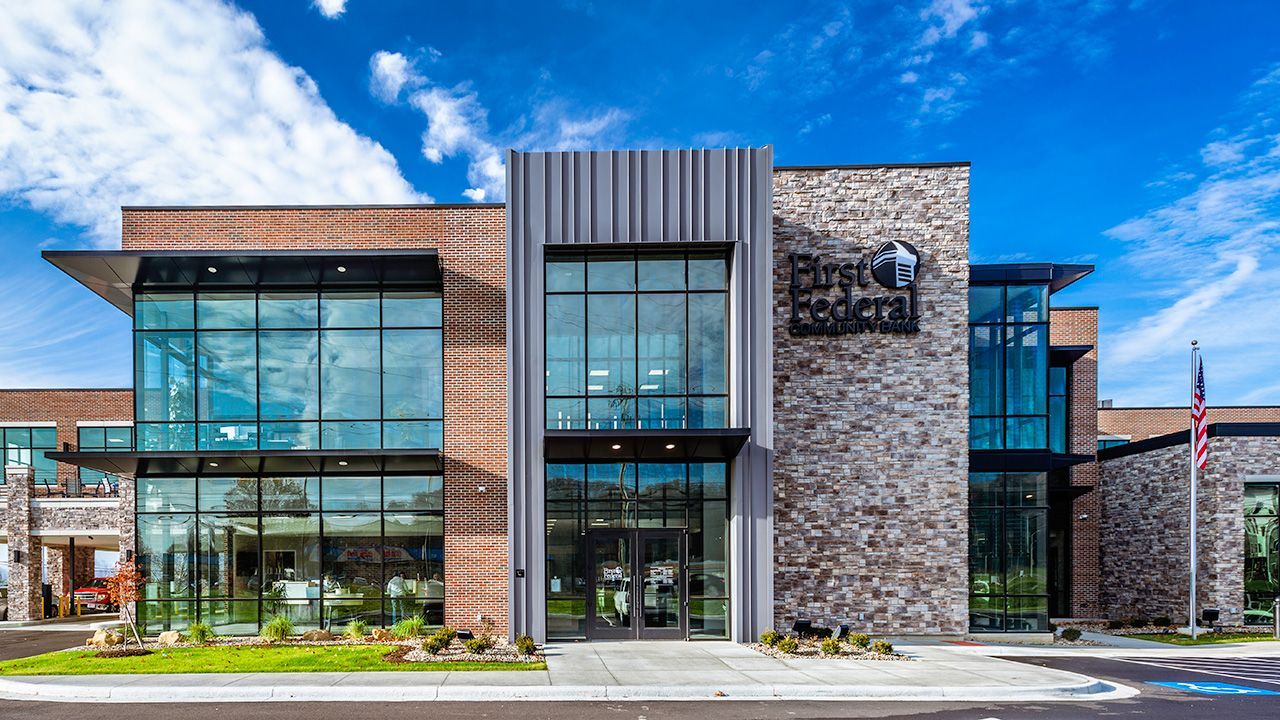 First Federal Community Bank approached K4 to develop a signature building for their new corporate headquarters and education center in Dover, OH. K4’s approach to the project was to create a more modern, open and inviting building using unique materials not found in the area – such as dark brick, cultured stone, a metal veneer panel system, and large expanses of glass. Several areas of the building have custom, full-glass corners, allowing for ultimate visibility and natural light throughout.