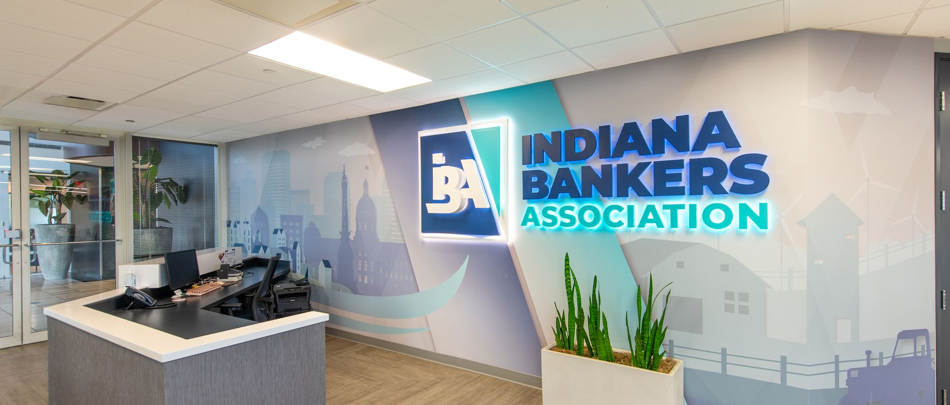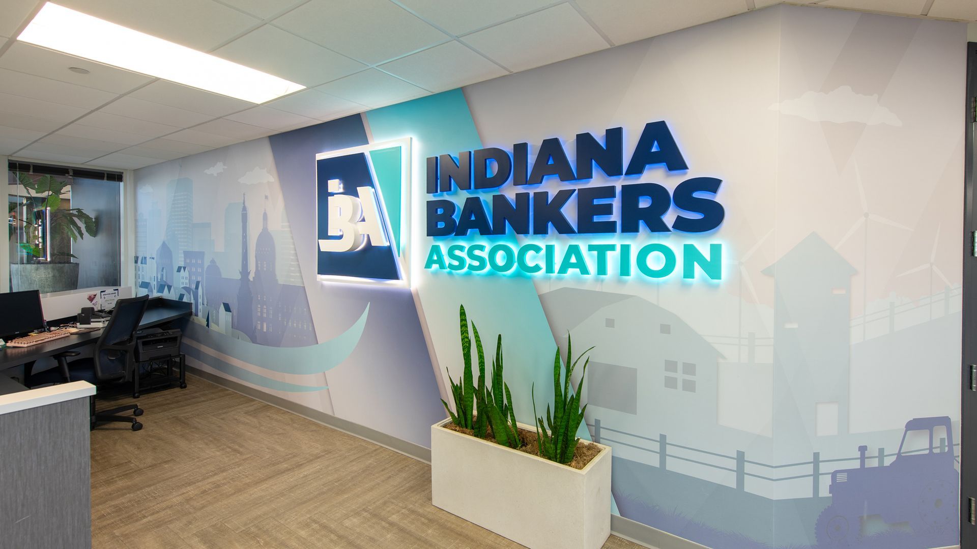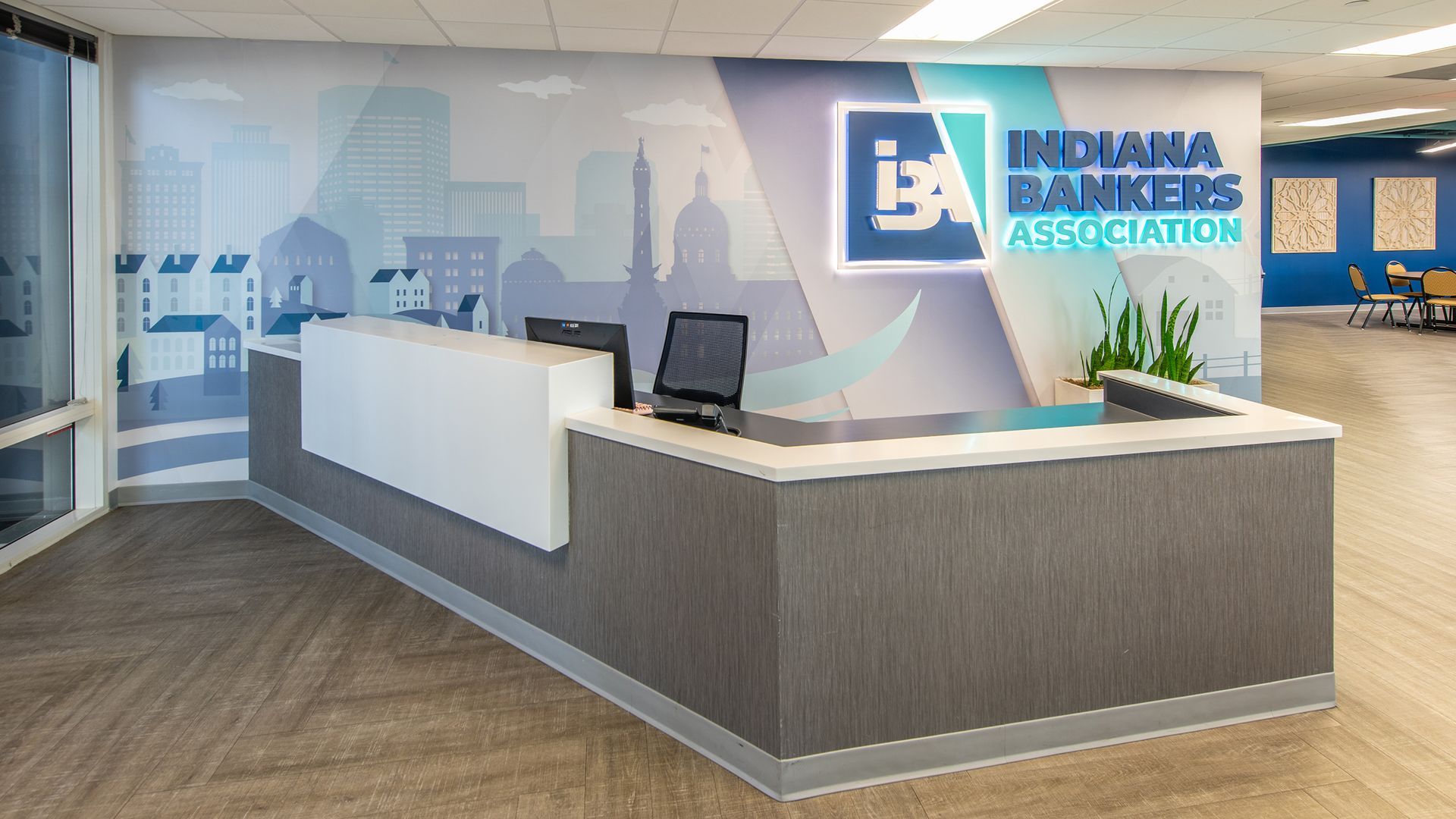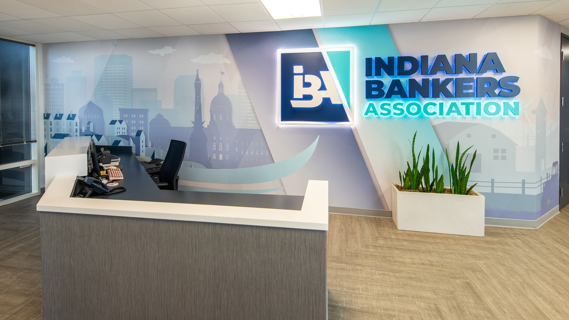 Developed as part of the IBA’s facility enhancements and comprehensive rebrand, the project reflects the organization’s role as the unified voice and advocate for banks across Indiana. The wall graphic serves as both a statement piece and a storytelling element within the Association’s Indianapolis headquarters welcoming members, visitors, and staff with a visual narrative that embodies the IBA’s statewide impact and leadership in the banking industry.
