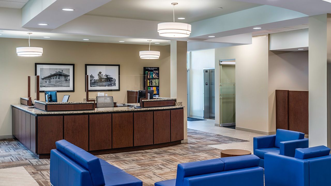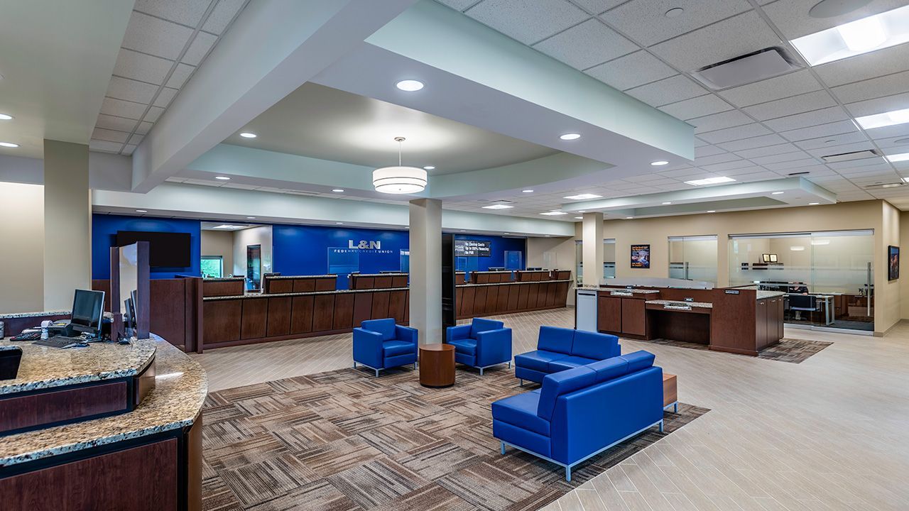 The brand identity was communicated through both the exterior and interior of the building, with consistent materials that were used with the design of their main campus & prototype branches. The complementary interior palette of materials and finishes upgraded the overall atmosphere with the use of warm wood tones, black metal accents, and the L & N brand color blue to work with their existing brand elements.