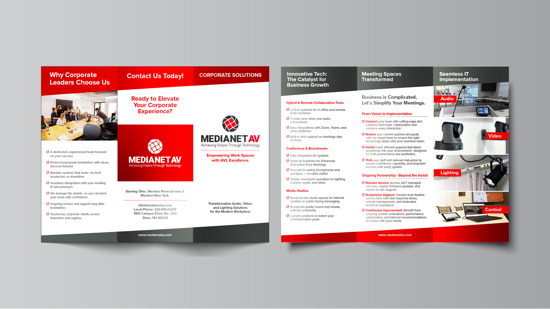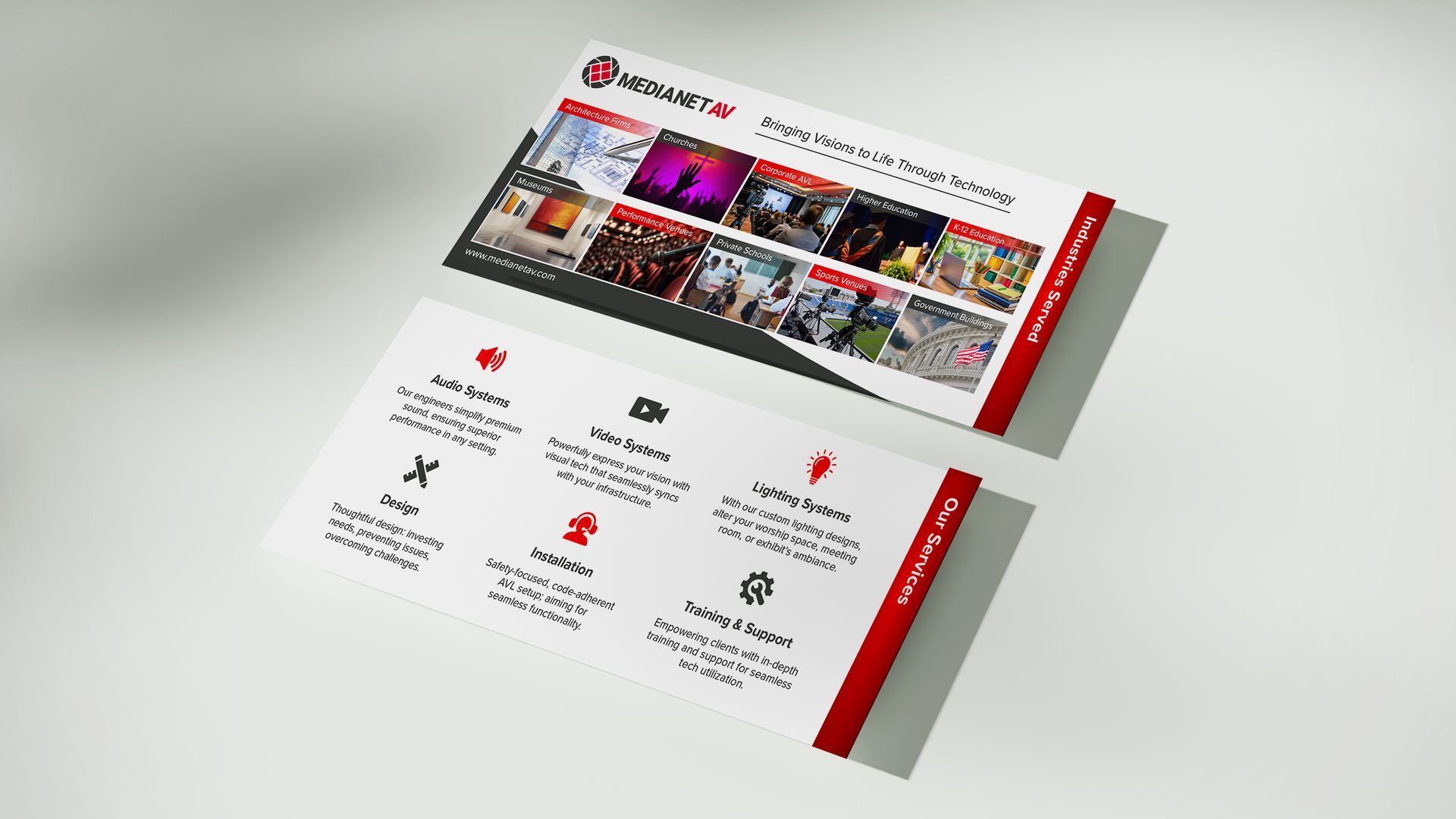 To support front-line sales and client-facing environments, K4 also designed a dual-sided counter card that quickly and clearly communicates MediaNet AV’s services and the sectors they serve—making it an effective tool for prospecting leave behind, walk-in traffic, events, and showroom display.