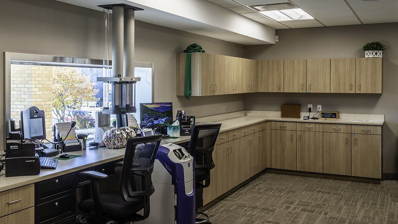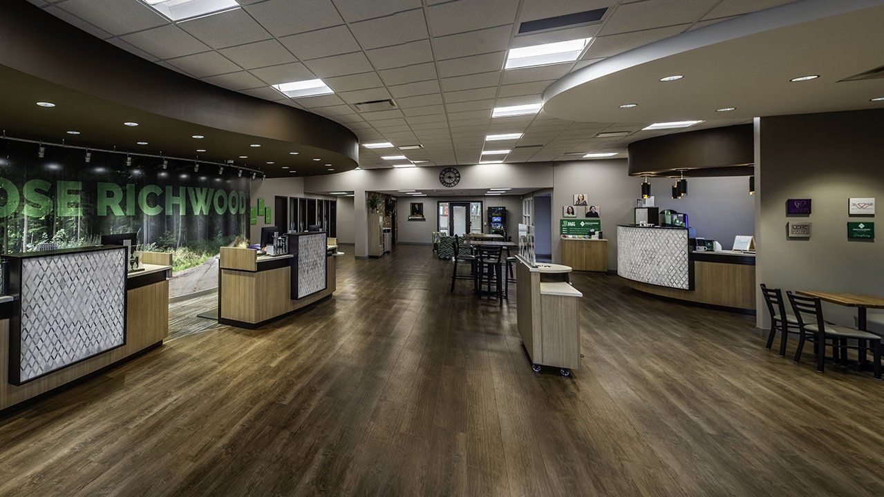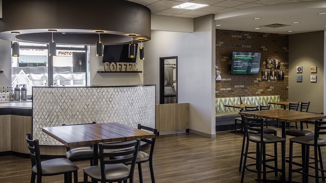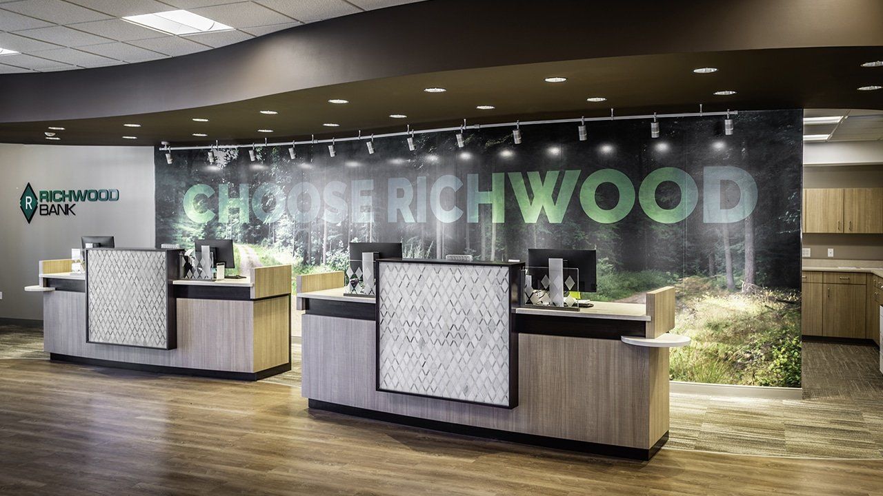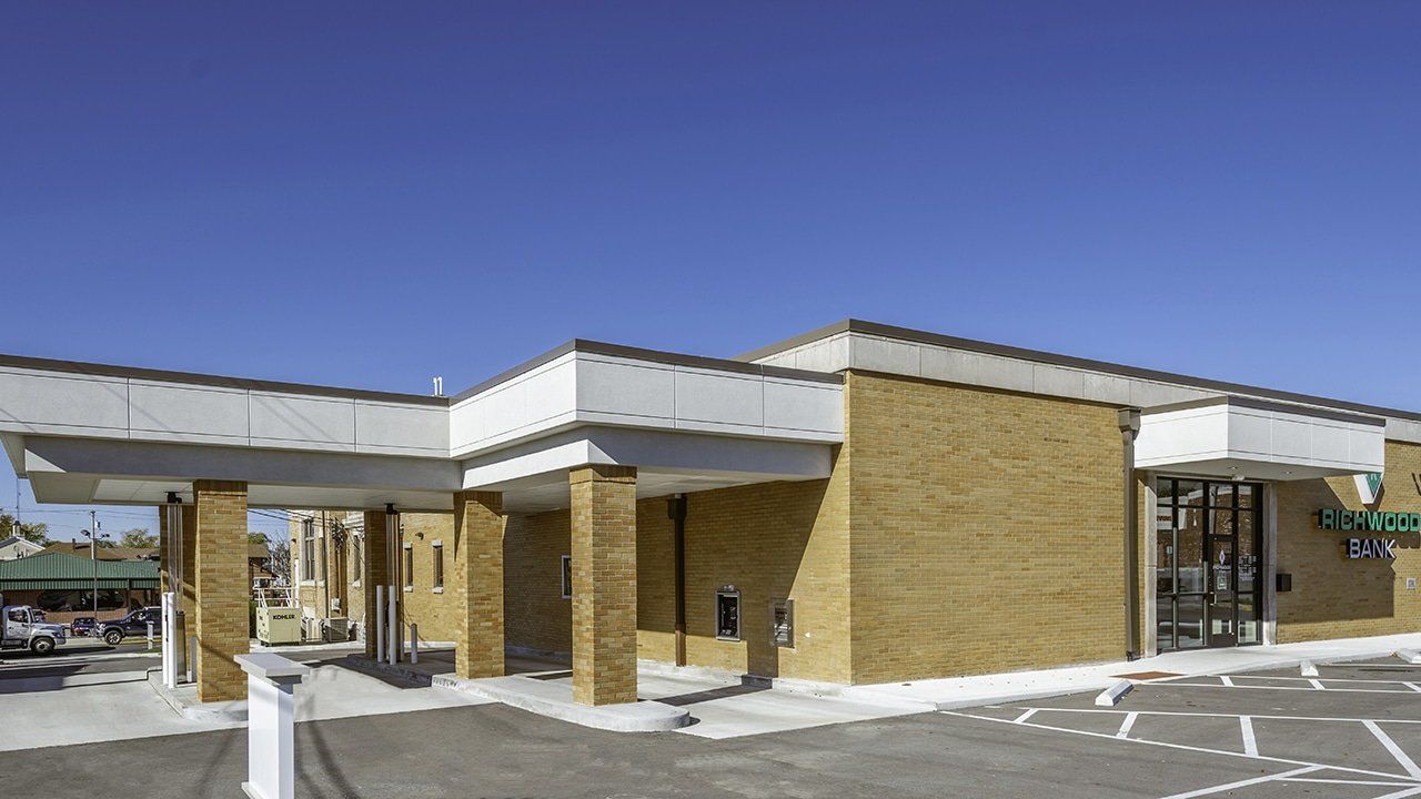 The project includes 8,230 s.f. of space on the main banking level, including two pods for four tellers, a Richwood Coffee café area with bar & other customer seating areas, six offices, a teller work area, a cash/ATM/night deposit room, and a safe deposit box room. The facility also has three drive-thru lanes, with the first lane being a drive-up ATM and night depository lane. The interior was transformed to an open, colorful space including Richwood branded finishes, casework, and graphics.