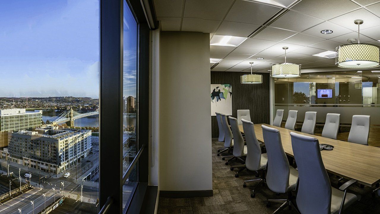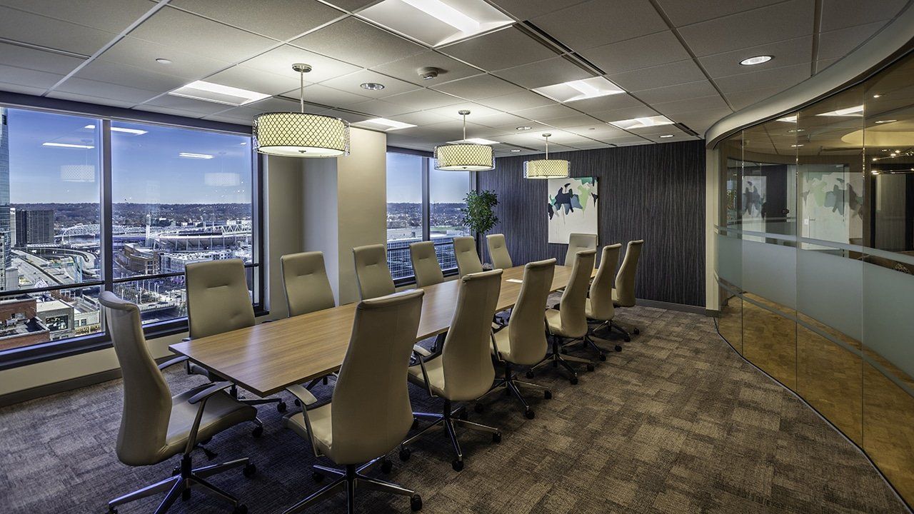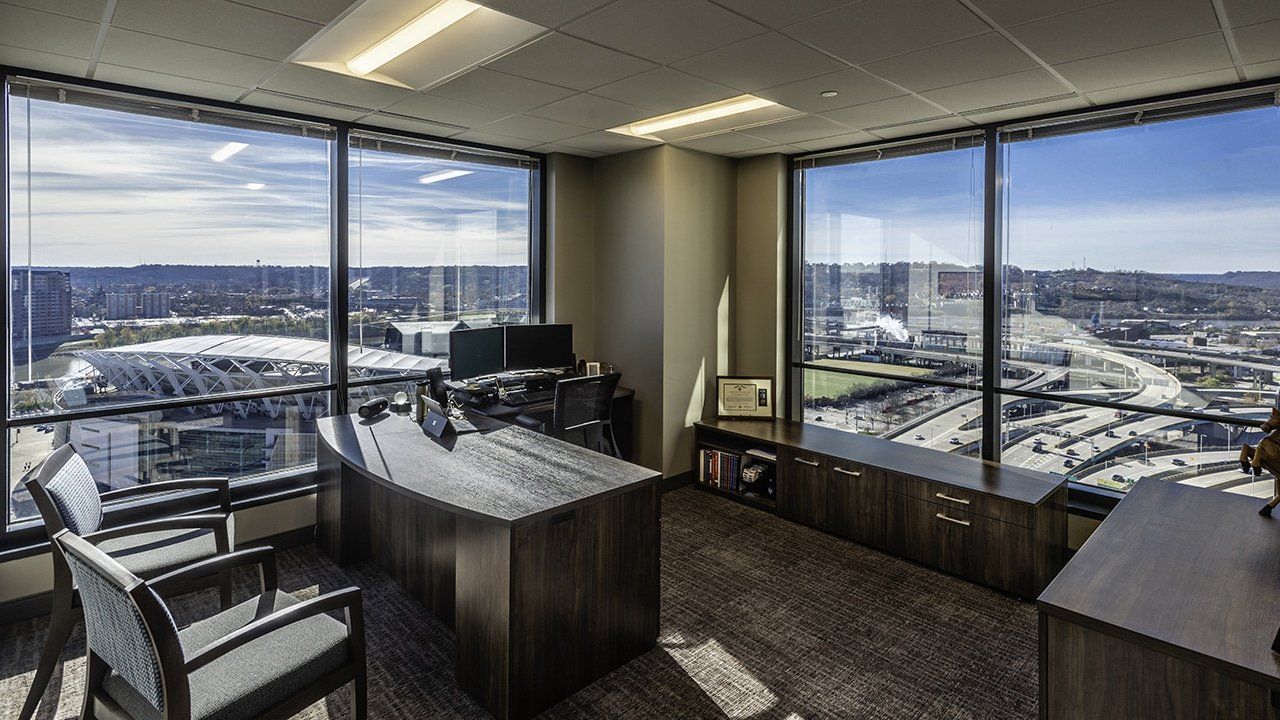 Highlights of the new office include an open, welcoming lobby featuring a full bar area and 2 full glass conference rooms, all allowing full panoramic views of downtown Cincinnati and the riverfront area. The various conference spaces throughout the office were designed to accommodate different types of meetings, including non-traditional meeting areas that feel more like a living room for a comfortable, modern aesthetic. The design challenge on this project was being able to capture these amazing panoramic views upon entrance and from multiple viewpoints throughout the space. Mission accomplished!