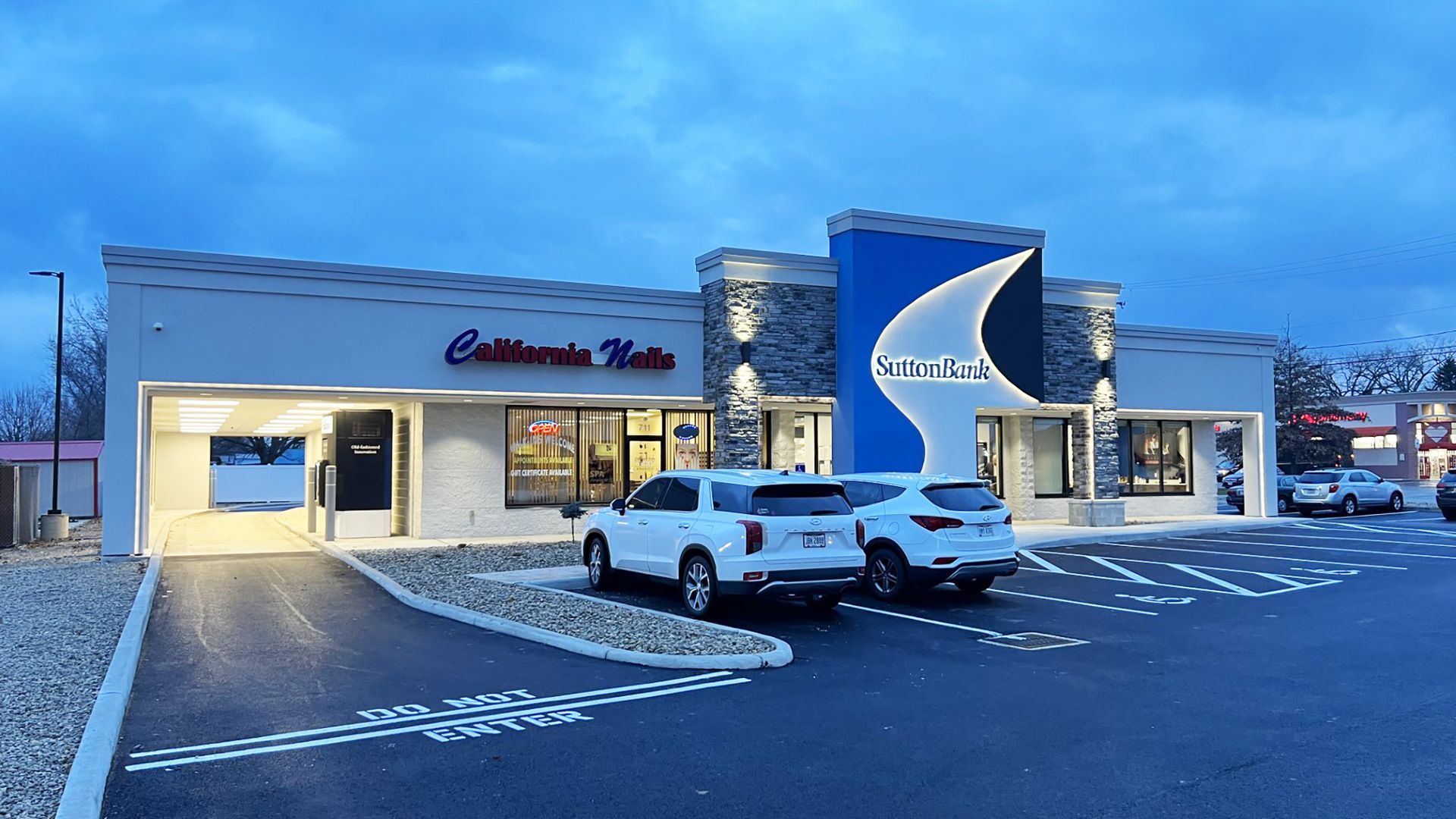 Exterior improvements included enhancement of the building façade to incorporate Sutton Bank’s well-established brand, and a relocation of the drive-thru to improve traffic flow around the facility. The improvements also included extensive site and building demolition and construction to complete the renovation project. The new drive-thru was created within the existing exterior walls of the retail center. A former tenant moved out of the facility, so K4’s creative team designed a concept of incorporating the drive-thru at the east end of the structure within the walls and roof structure of the existing structure. The new building façade has an EIFS tower feature resembling Sutton Bank’s iconic logo, cultured stone veneer, and North Elevation façade complete with EIFS canopy and new aluminum storefront doors and windows.β
