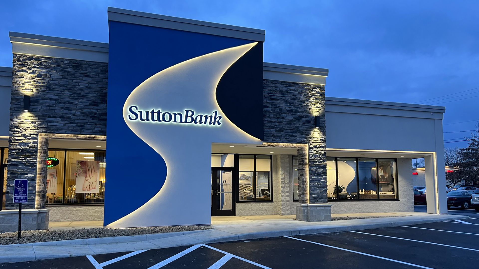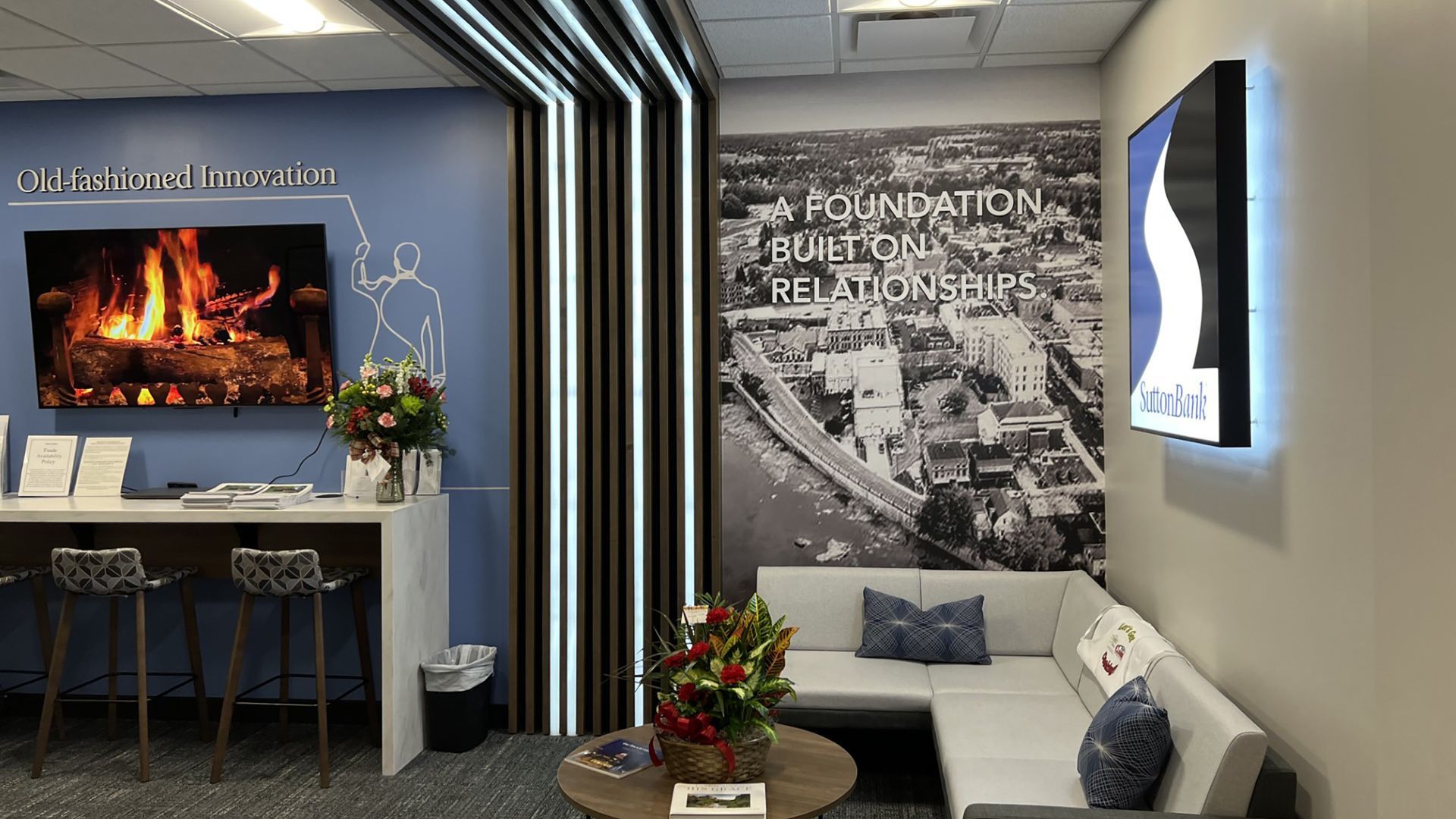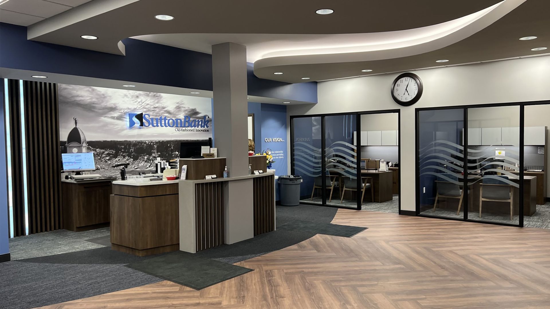 βThe interior work involved demolition and construction to completely renovate the current Sutton Bank tenant space to combine with the adjacent vacant tenant space to expand the size and improve functionality within the facility. Sutton Bank has also made a significant branding investment with incorporated brand elements throughout both the facility exterior and interior.