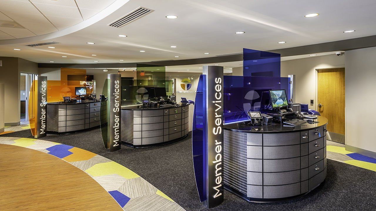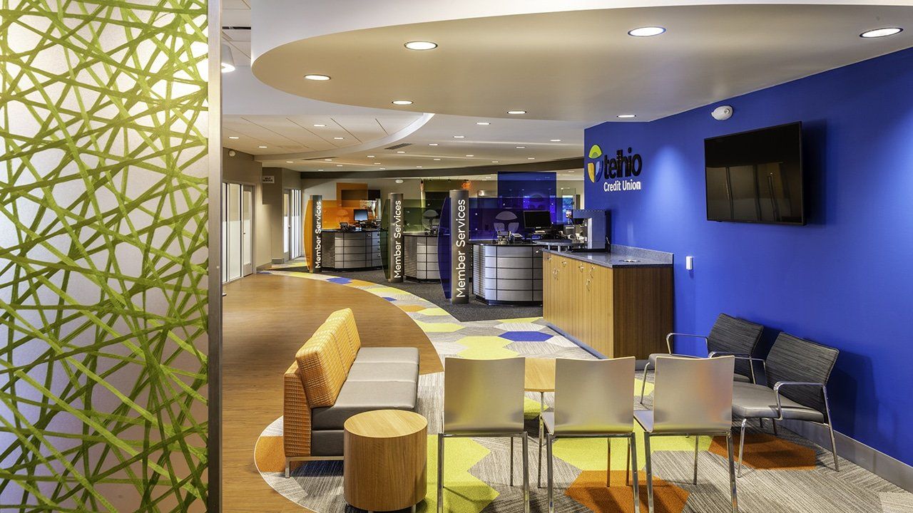 The closed interior was transformed to an open, colorful space including Telhio branded casework and finishes. The design provides a variety of accommodations for the credit union to serve its members including self-serve stations, service assistance stations, teller pods, and closed offices. The design added a community room as a gesture of community citizenship to surrounding Fairfield and also serves as a multimedia boardroom for the credit union.