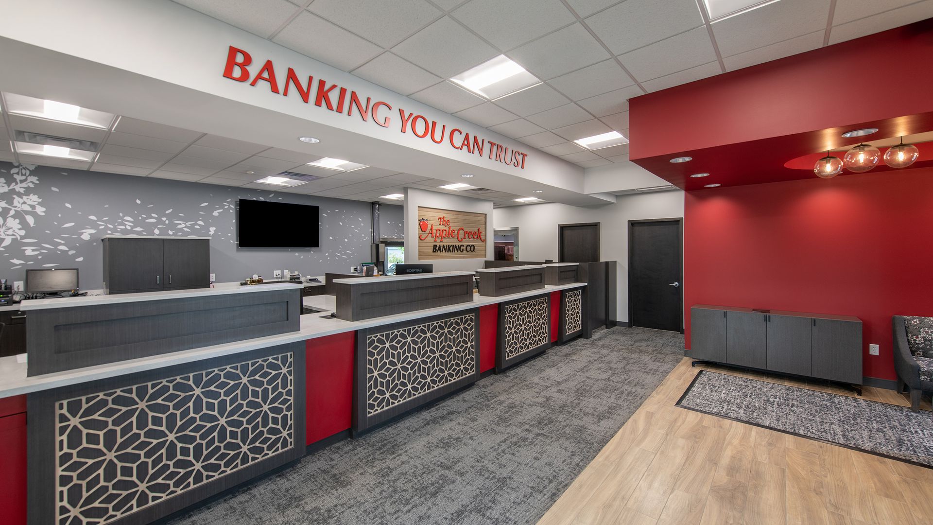 - Inside the building, both the existing and newly added spaces were updated with new finishes, furniture, equipment, and graphics to align with Apple Creek’s updated brand standards.