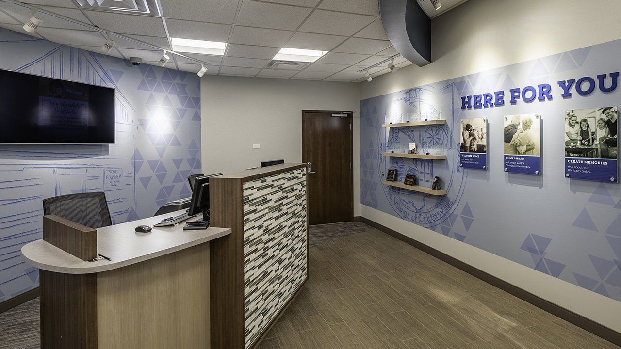 The first challenge the K4 team faced was flipping the building’s layout to relocate the credit union’s main entrance to the rear of the building to make entering the branch easier for members. The existing building was set up to have members enter from a busy street. The new layout also eliminated the security concerns of having two entrances. K4 created branded exterior visuals to help identify the building on Cridersville’s main street and reinforce the brand’s place in the community.