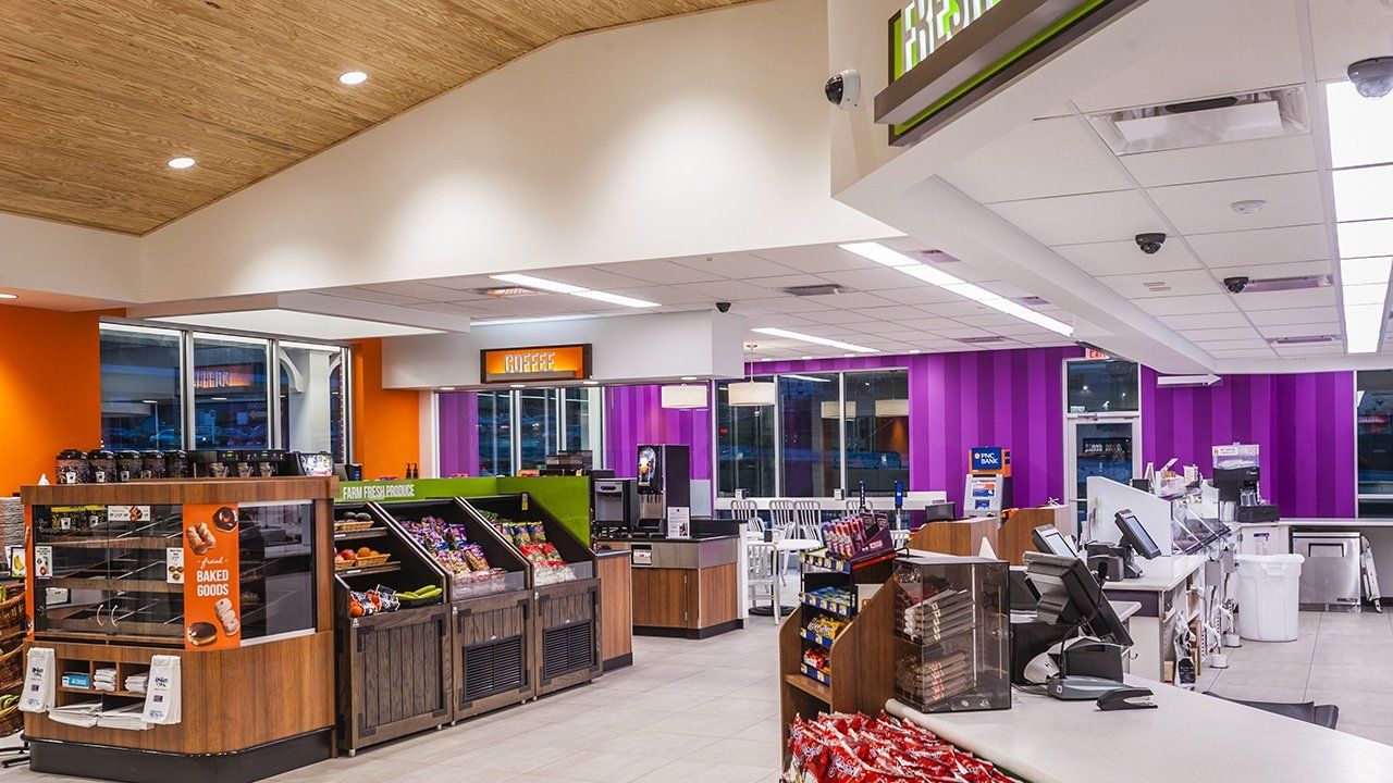Upon entering the store, customers are greeted by a large vaulted ceiling with wood bead board cladding. Colorful signage helps to direct customers to the coffee, cold drinks, ice cream, beer or groceries. An enlarged parlor space surrounded by glazing provides customers a space to comfortably mingle while watching traffic outside.
