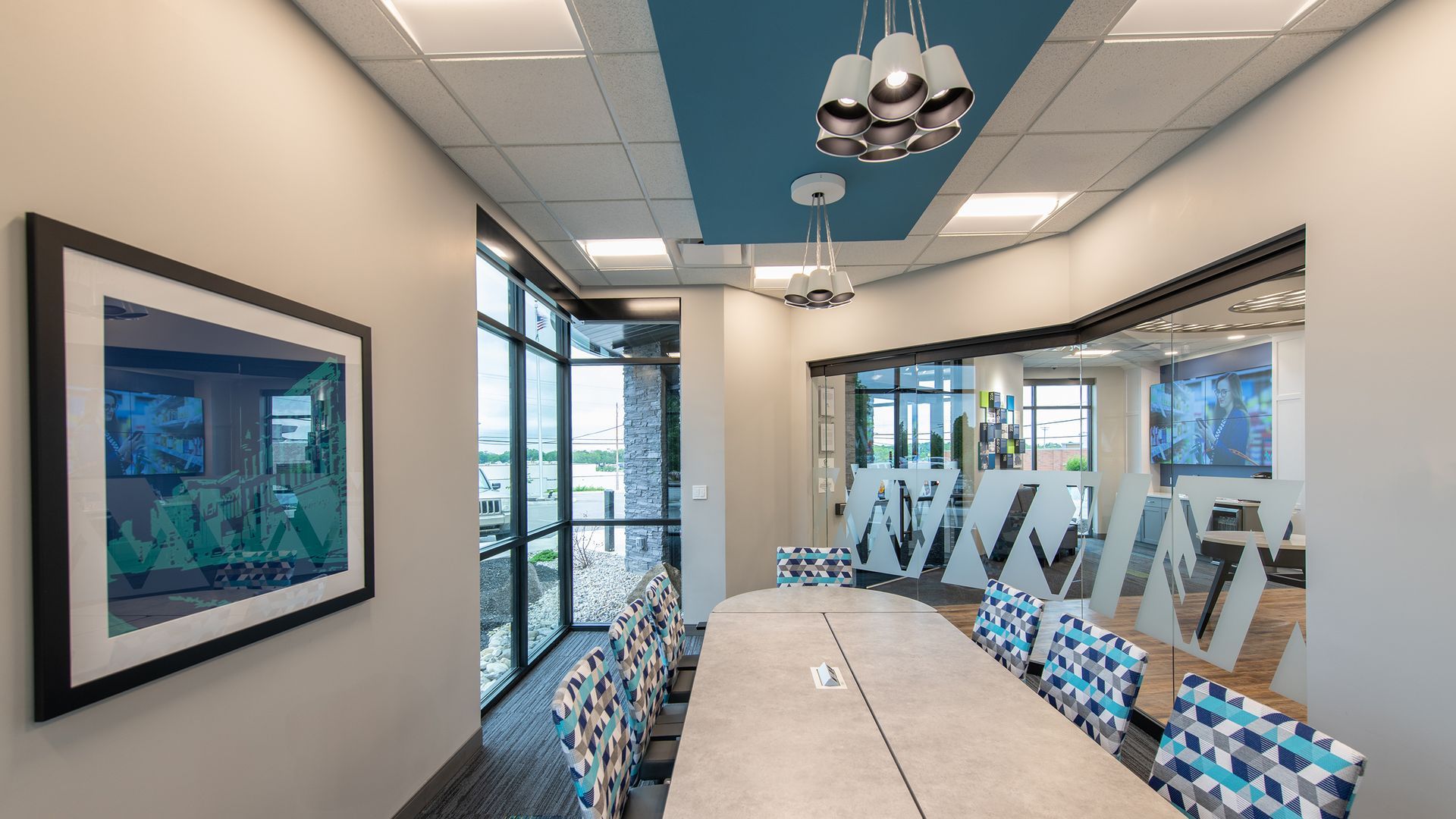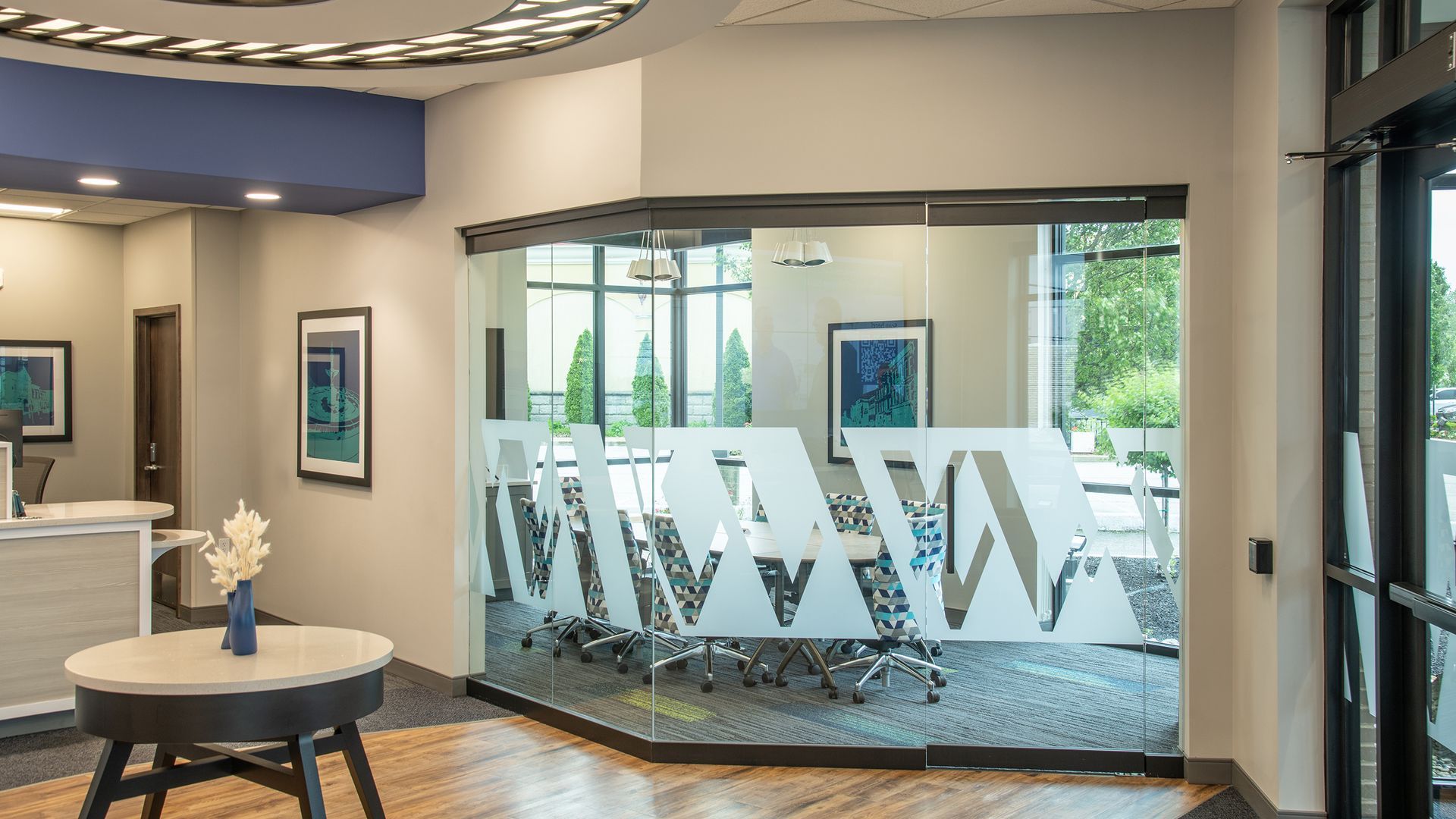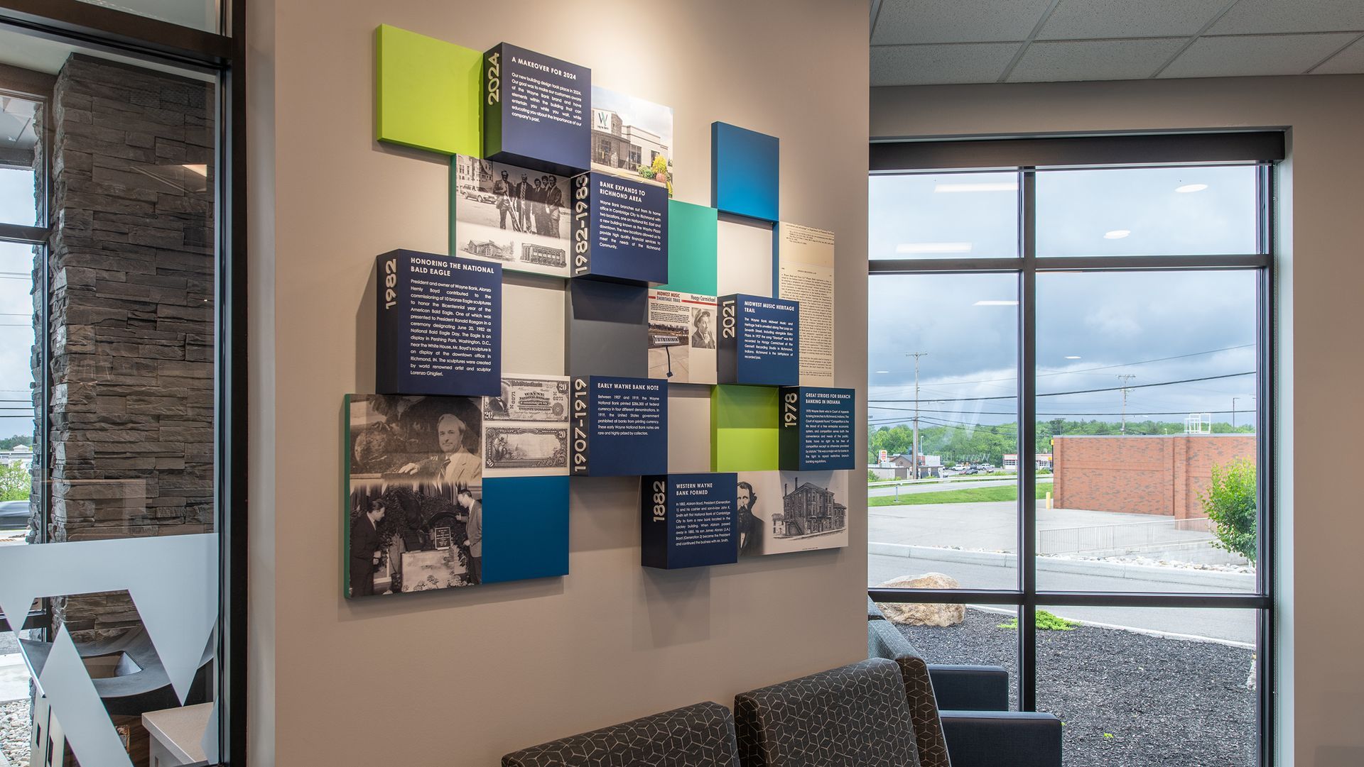 Inside, a cool gray palette with accents of blue and teal drawn from Wayne Bank’s branding creates a modern yet welcoming environment. Corner glass features and a masonry exterior provide a striking architectural presence, while custom environmental graphics—including a local history wall—celebrate the City of Richmond and deepen community connection.