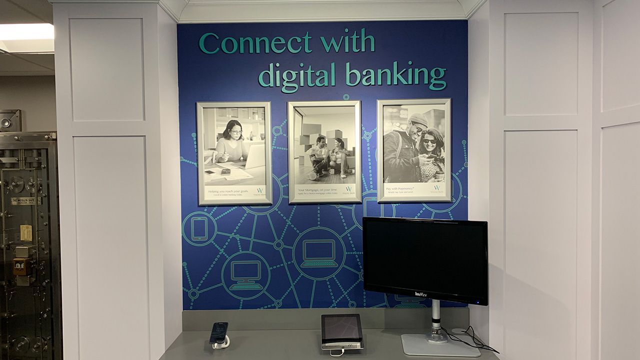 The modern interior gave K4 more flexibility and opportunity to blend new branding inside with colors, finishes, furniture, and graphics. The graphics pulled in elements unique to the town, from the feature wall mural to the history wall that highlights the rich history of Wayne Bank and Cambridge City.